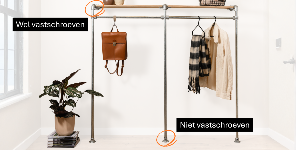 In deze situaties staat de verticale buis stevig in de koppeling. De voetplaat dient hier uitsluitend als stabiele ondergrond en heeft geen bevestiging nodig. Het meubel blijft stabiel omdat het gewicht gelijkmatig wordt verdeeld en de verbindingen tussen de buizen en koppelingen sterk zijn.