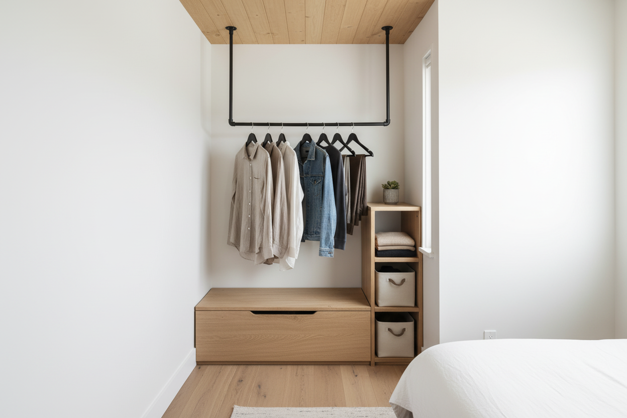 Dat is ook precies waarom slimme DIY-meubels in kleine woningen zo goed werken. In een compacte ruimte moet een meubel bijdragen aan overzicht, rust en gemak. Een open kledingrek in de slaapkamer of studio houdt de ruimte lichter dan een dichte kledingkast en geeft toch voldoende plek aan kleding die je dagelijks gebruikt. Een open stellingkast van steigerbuis is ideaal voor boeken, manden, accessoires en decoratie, terwijl de ruimte open blijft ogen. Wandplanken met buiskoppelingen maken gebruik van muren die anders leeg blijven en zijn perfect boven een bureau, in de keuken of in de hal. Ook een kapstok met extra functionaliteit kan in een kleine entree veel verschil maken, omdat jassen, tassen en schoenen anders al snel voor rommel zorgen.