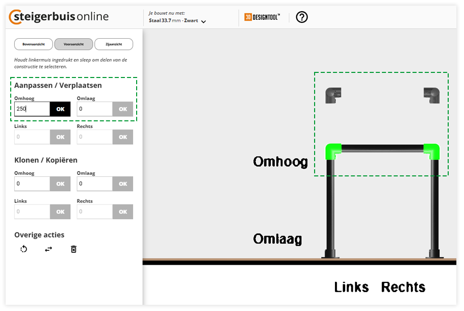 Voor het aanpassen van de hoogte werken we vanuit het vooraanzicht. Via linkermuis + slepen kun je de bovenste koppelingen selecteren. Vervolgens kun je via het scherm links de gewenste aanpassing invoeren.