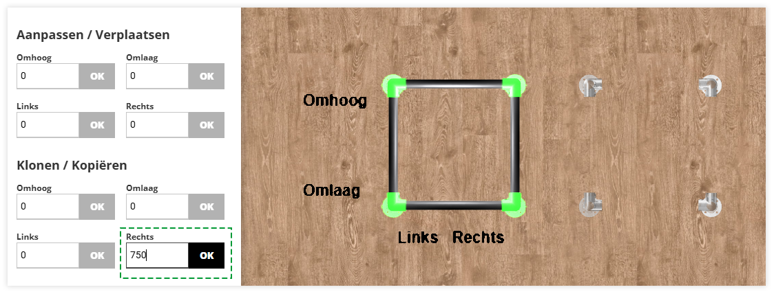 Vervolgens kun je via het scherm links de gewenste waardes invoeren. In dit voorbeeld gaan we de constructie 750 mm naar rechts klonen en plaatsen op de werkvloer. Voer 750 in en klik op OK.