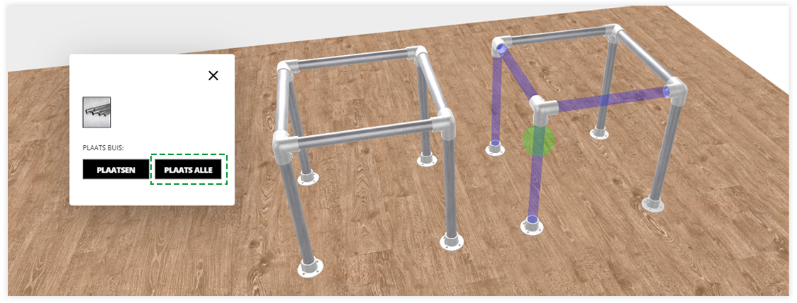 De constructie is nu aangepast en je kunt terug naar de 3D weergave of nog meer aanpassingen maken. Soms is het nodig om nog enkele buizen te plaatsen. Dit kan eenvoudig via in de 3D weergave.