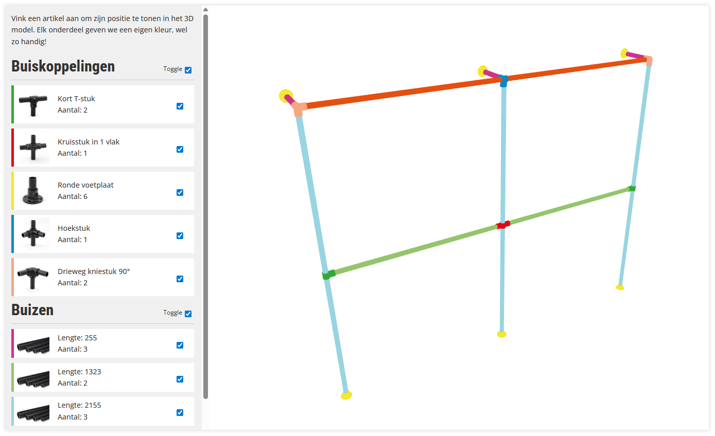 Zo zie je direct welke buizen en buiskoppelingen je nodig hebt en waar ze geplaatst moeten worden. Of je nu een kapstok, tafel, kledingrek of een ander DIY-project bouwt: de interactieve werktekening maakt het monteren super eenvoudig.