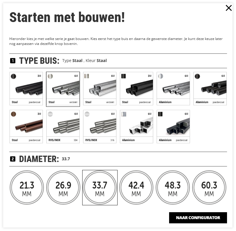 Let op: Soms is een keuze niet mogelijk, de 'naar configurator' knop blijft dan uit. Dit komt omdat het switchen niet mogelijk is door een verschil in assortiment. Zo is bijvoorbeeld een Ovale Voetplaat niet leverbaar in de 25x25mm serie.