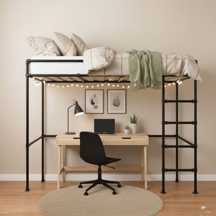 Dit stoere steigerbuis hoogslaper is uitgevoerd in zwarte steigerbuis 33,7 mm.