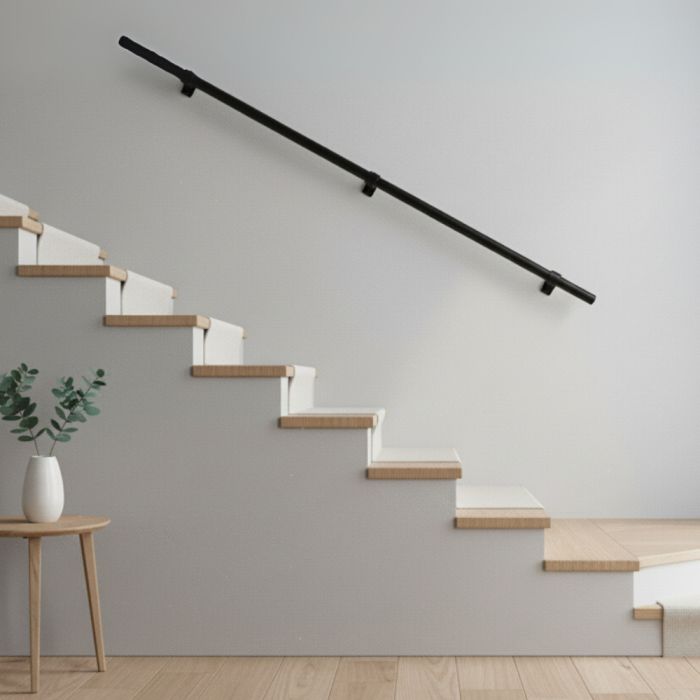 Zoek je een lichte maar stevige trapleuning met een moderne uitstraling? Trapleuning Keila, uitgevoerd in zwarte aluminium steigerbuis (42,4 mm), biedt een robuust design met een strak en industrieel karakter. Dankzij de drie leuningdragers bepaal je zelf de ideale montagepositie voor optimale stabiliteit. De afstand van de muur tot de buitenkant van de trapleuning is 90 mm, wat zorgt voor een comfortabele grip. Houtdraadbouten en pluggen zijn los verkrijgbaar. Heb je een breedte nodig onder de 1500 mm? Kies dan voor trapleuning Rapla.